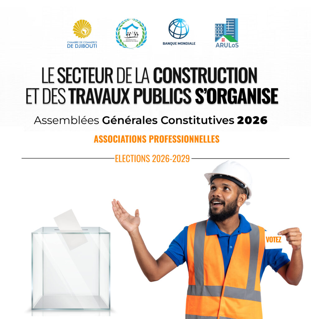 La Chambre de Commerce de Djibouti organise les Assemblées Générales Constitutives des quatre sous-secteurs du BTP. À cette occasion, les opérateurs économiques sont invités à élire les bureaux exécutifs qui représenteront leur secteur d’activité pour la mandature 2026-2029. Chaque professionnel est attendu à l’assemblée générale correspondant à son sous-secteur.