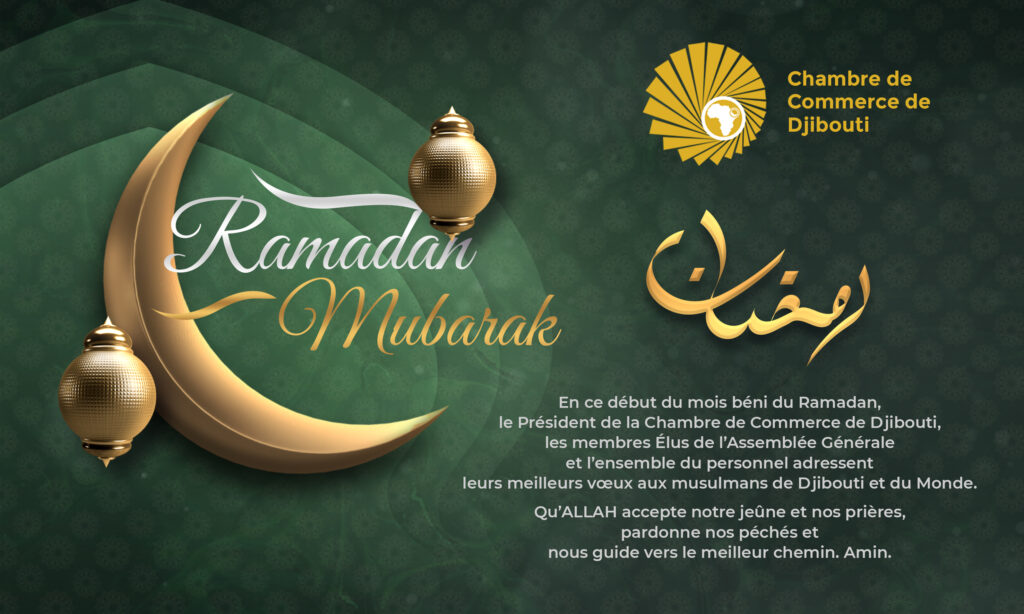 En ce début du mois béni du Ramadan, le Président de la Chambre de Commerce de Djibouti, les membres Élus de l’Assemblée Générale et l’ensemble du personnel adressent leurs meilleurs vœux aux musulmans de Djibouti et du Monde. Qu’ALLAH accepte notre jeûne et nos prières, pardonne nos péchés et nous guide vers le meilleur chemin. Amin.